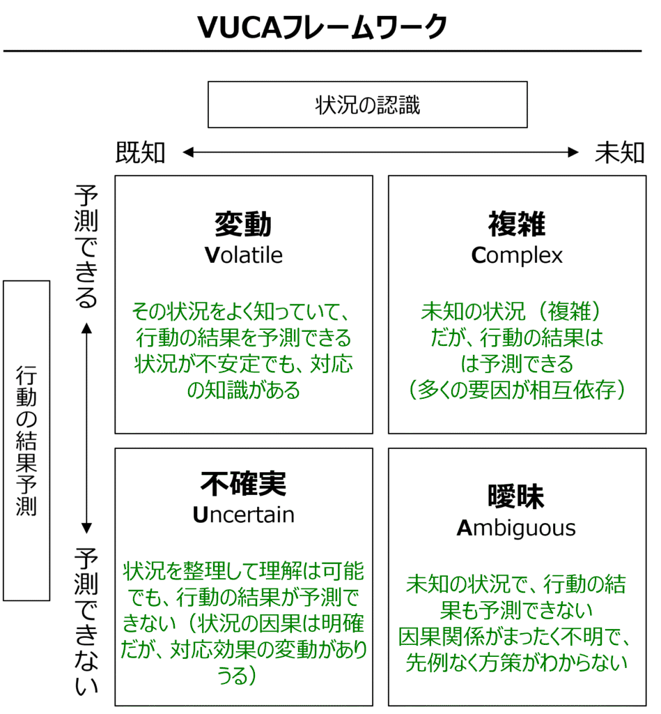 現代は、顧客基点への転換に加え、「VUCA(Volatility, Uncertainty, Complexity, Ambiguity)」と呼ばれる変動性の高い社会環境にあります。かつてのように過去の経験則から状況を正確に認識し、行動の結果を予測することが難しくなっています(下の図ご参照)。
