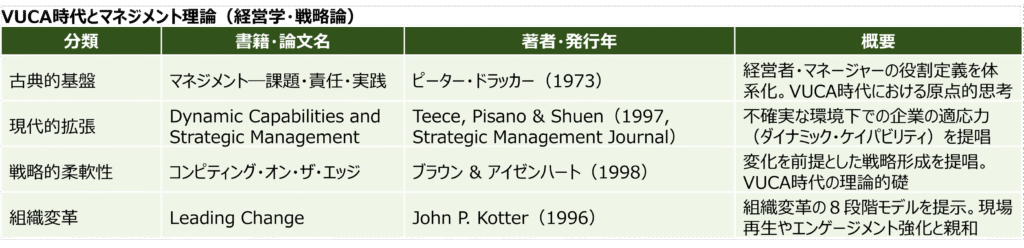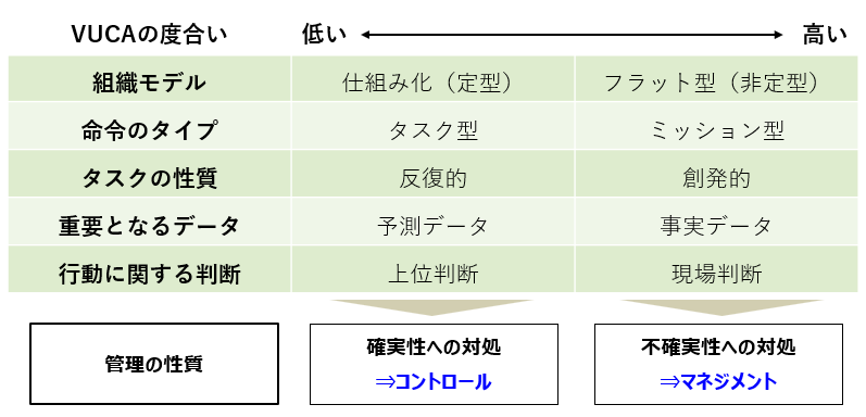 - 一方、VUCA度が高い環境では、予測不能性が増すため、組織はフラット化し、ミッション共有による自律的判断が求められます。ここで重視されるのはマネジメント(不確実性への対処)です。