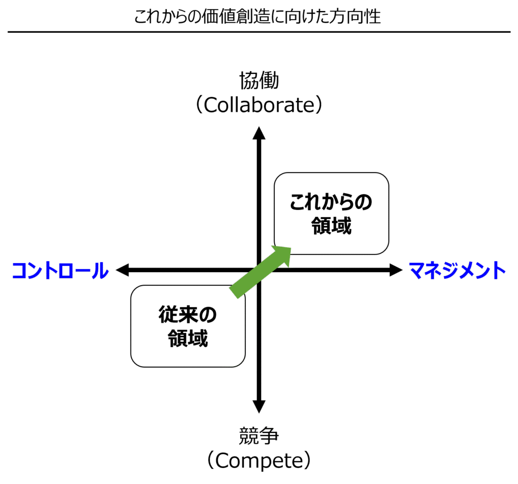 モノの時代にはレバレッジ戦略(自社強化)が有効でしたが、コトの時代では他社資源との組み合わせによる「共創」が成長の鍵です。 したがって、管理スタイルも「コントロール×競争」から「マネジメント×協働」へとシフトする必要があります。
