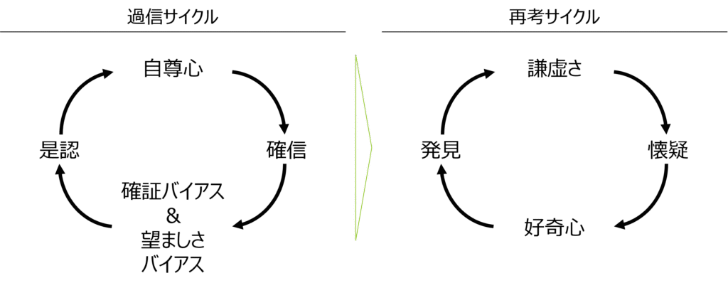 これに対し、「再考サイクル」への切り替え――すなわち自らの考えを常に疑い、謙虚さを保つこと――を提唱しています。